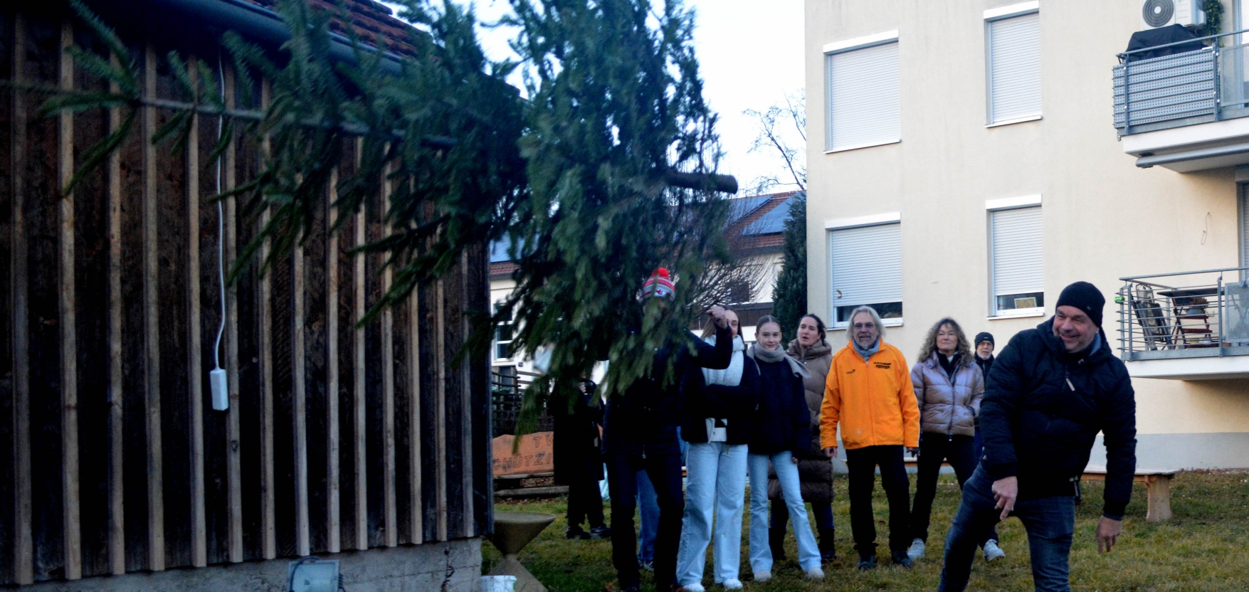 In Schützingen fliegen beim legendären Weihnachtsbaum-Weitwurf die Christbäume