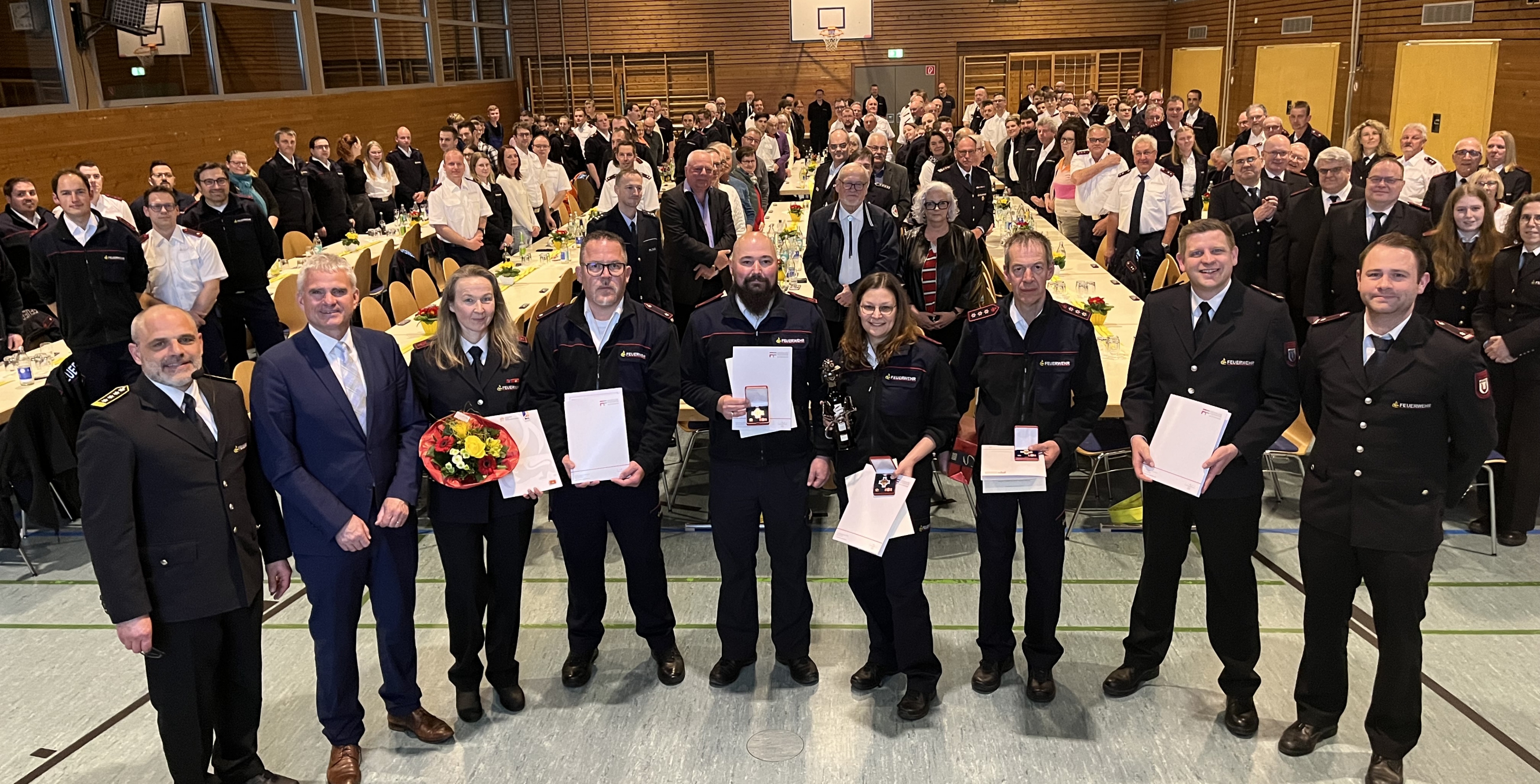 Ehrungen und Beförderungen bei der Sachsenheimer Feuerwehr (von links): Kommandant Philipp Rousta, Bürgermeister Holger Albrich, Sabine Busch, Achim Braun, Julian Haaga, Eva Mollenkopf, Thomas Tenta, Michael Gennert und Marcel Reinke. Foto: Glemser