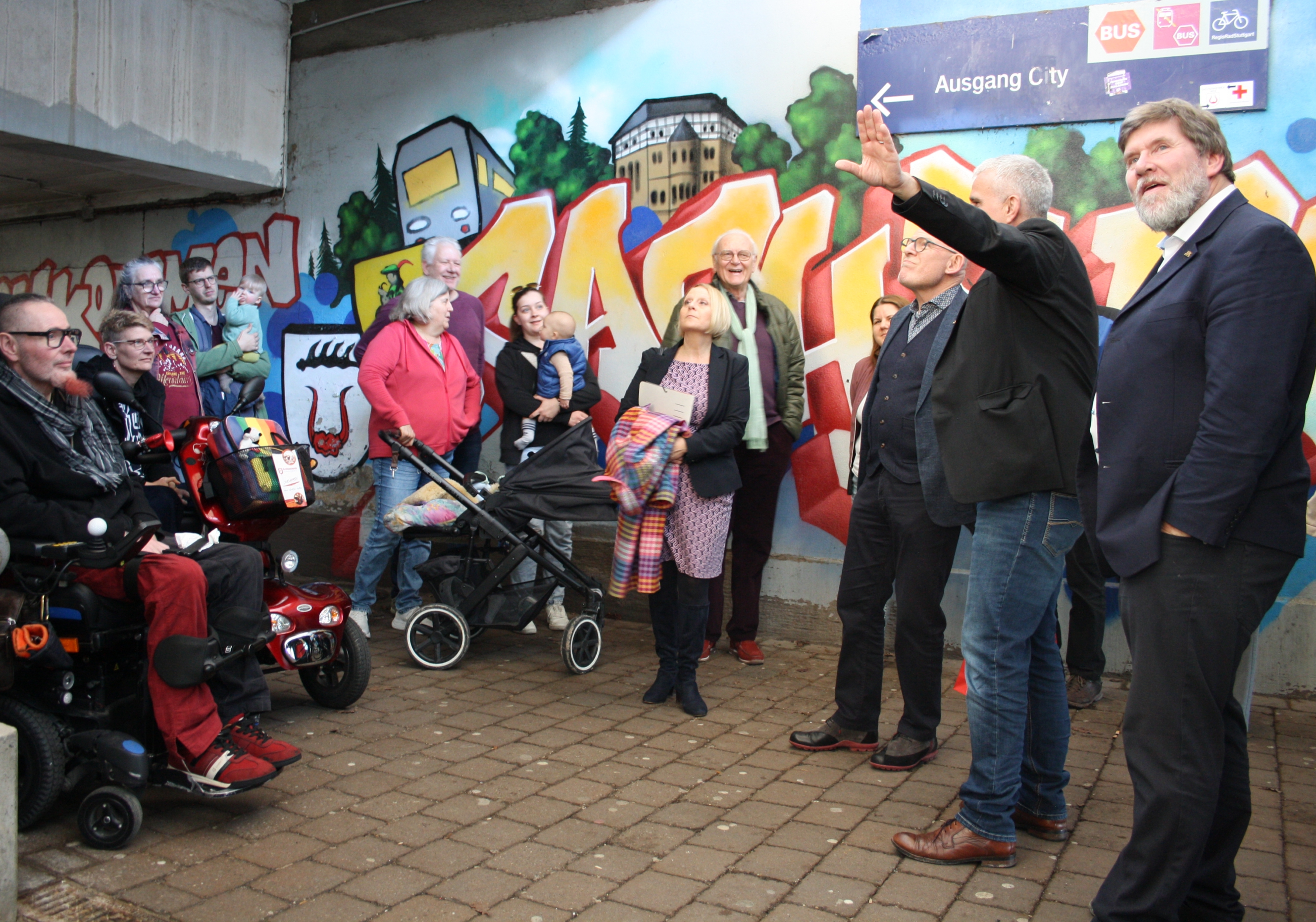 Kein Aufzug, keine Rampe: Holger Albrich (2. v. r.) erklärt Winfried Hermann (3. v. r.) die Situation am Sachsenheimer Bahnhof. Foto: Mross