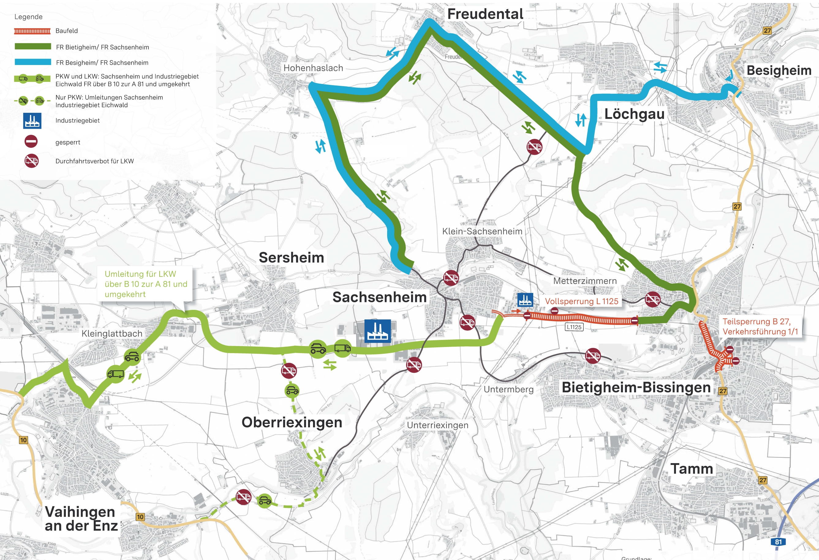 Die Landesstraße 1125 wird zwischen Sachsenheim und Bietigheim gesperrt, die Umleitung führt über Freudental. Grafik: RP Stuttgart