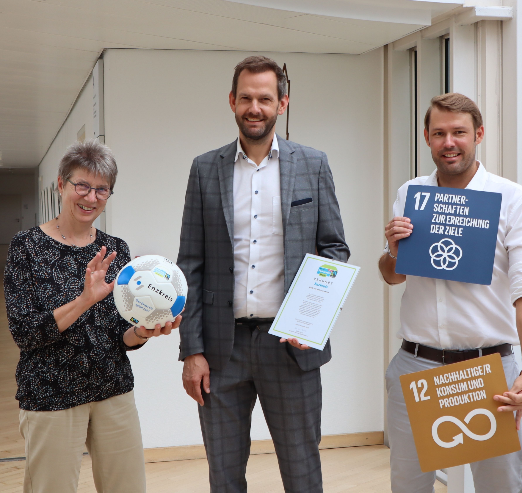 Landrat Bastian Rosenau (Mitte) freut sich gemeinsam mit Angela Gewiese und Dr. Jannis Hoek über die erneute Auszeichnung des Enzkreises als Fairtrade-Landkreis und damit über die Anerkennung des Engagements für mehr globale Gerechtigkeit. Foto: Enzkreis/Sonja Frommer