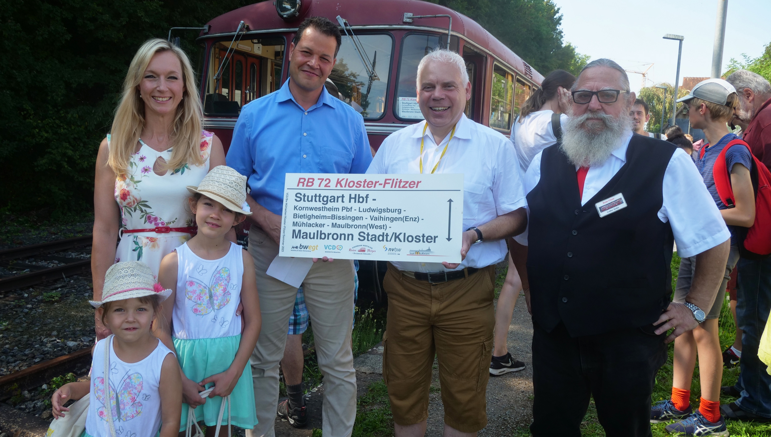 Der Kloster-Flitzer soll bald dauerhaft fahren. Symbolisch überreicht der VCD-Landesvorsitzende Matthias Lieb (Zweiter von rechts) ein Zuglaufschild an Bürgermeister Aaron Treut (Dritter von rechts), im Beisein von dessen Familie und Zugchef Lothar Stehle. Foto: Friedrich