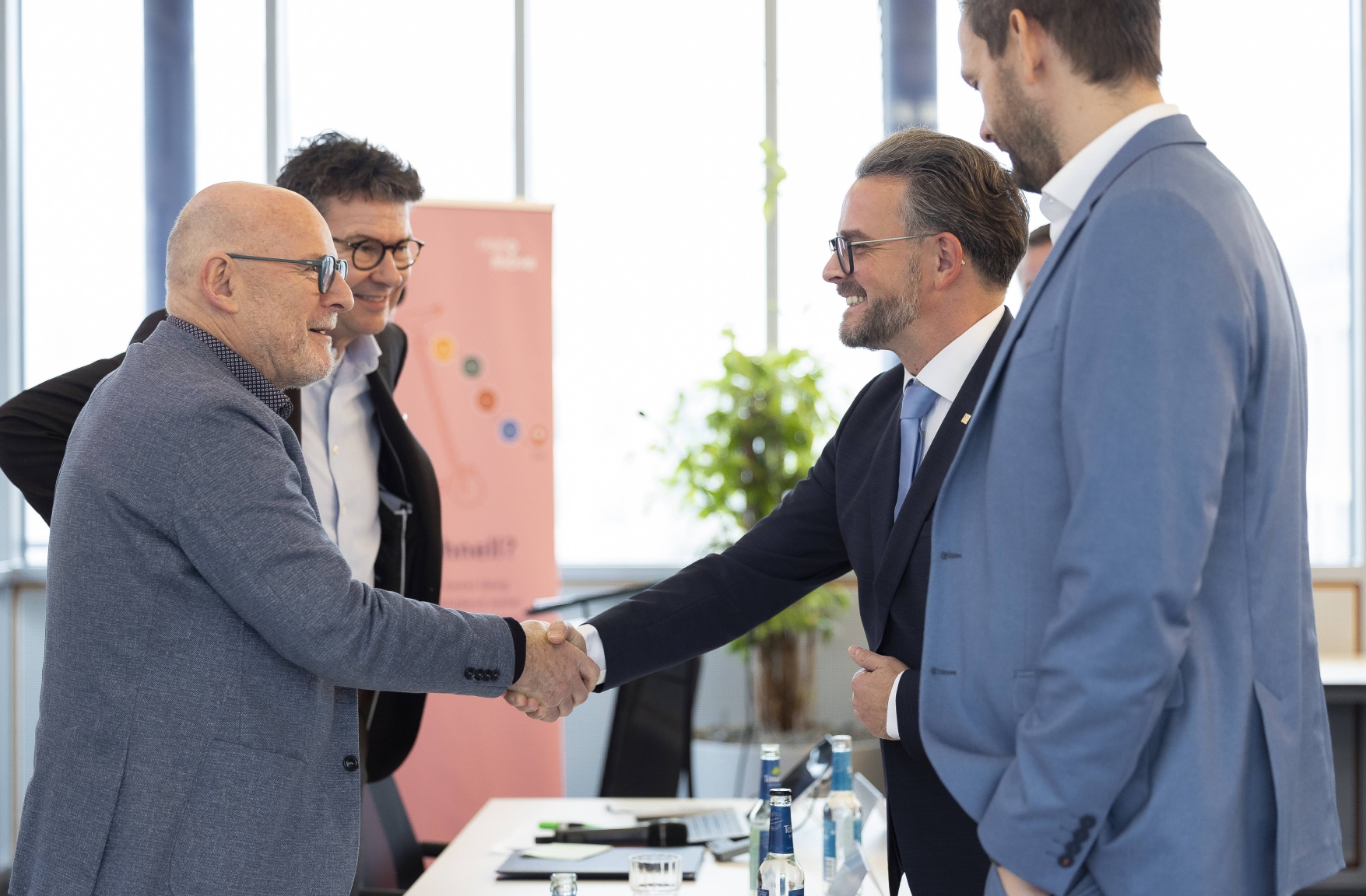 Handschlag: Verkehrsminister Winfried Hermann (von links), KVV-Geschäftsführer Alexander Pischon, Pforzheims Oberbürgermeister Peter Boch und Enzkreis-Landrat Bastian Rosenau freuen sich über den erfolgreichen Gesellschafterbeitritt. Foto: Gärtner/KVV