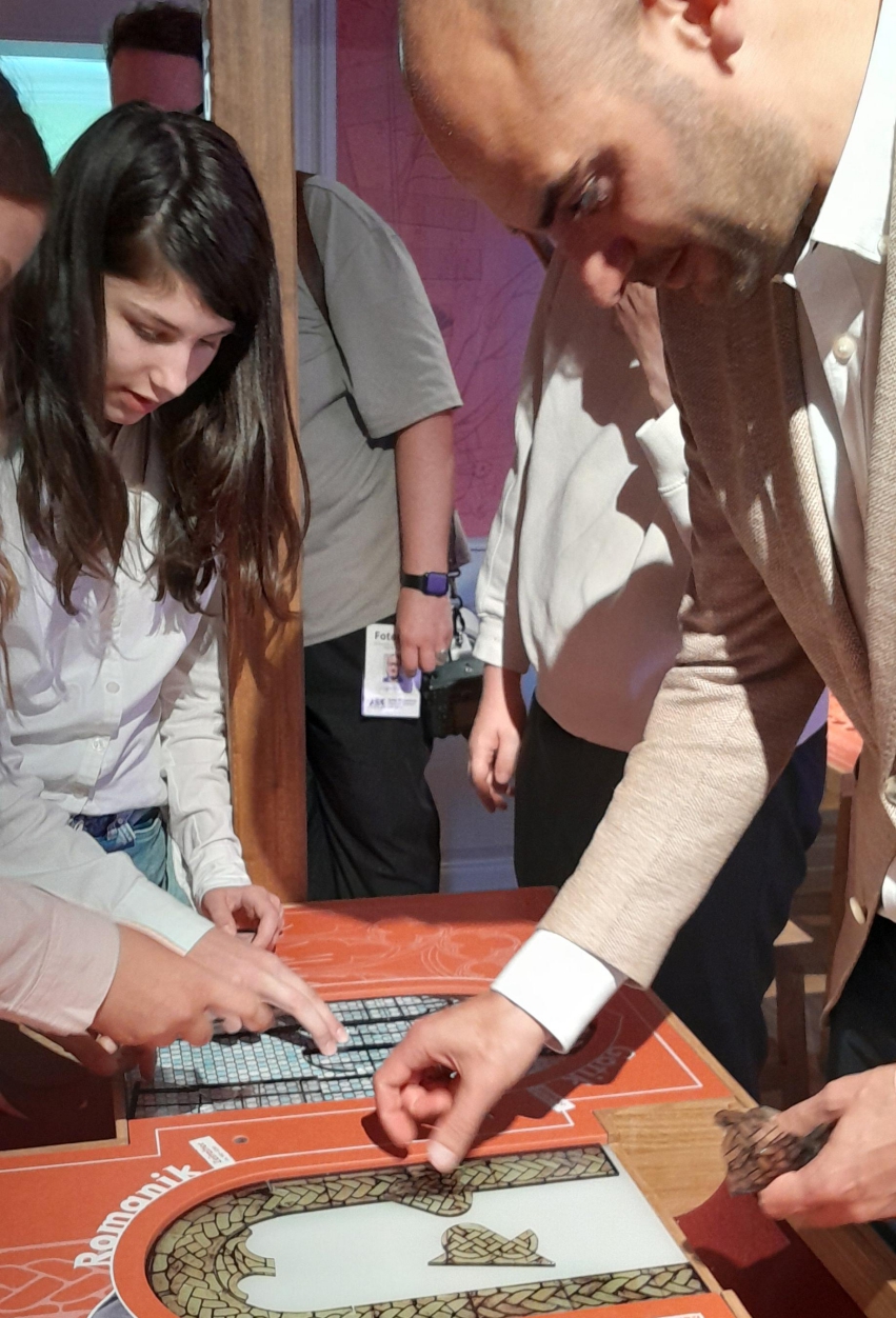 Fenster im Baustil der Gotik oder Romantik sind an diesem Tisch zu gestalten. Wer zuerst fertig ist, dessen Fenster leuchtet hell.