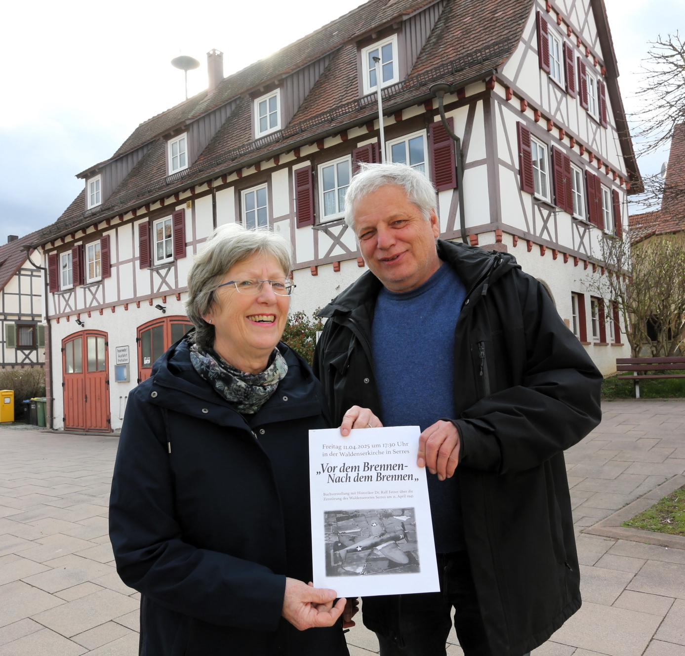 Cornelia Schuler und Dr. Ralf Fetzer präsentieren das Buch vor dem neuen Rathaus, das heute an Stelle der alten Zehntscheuer steht. Foto: Küppers