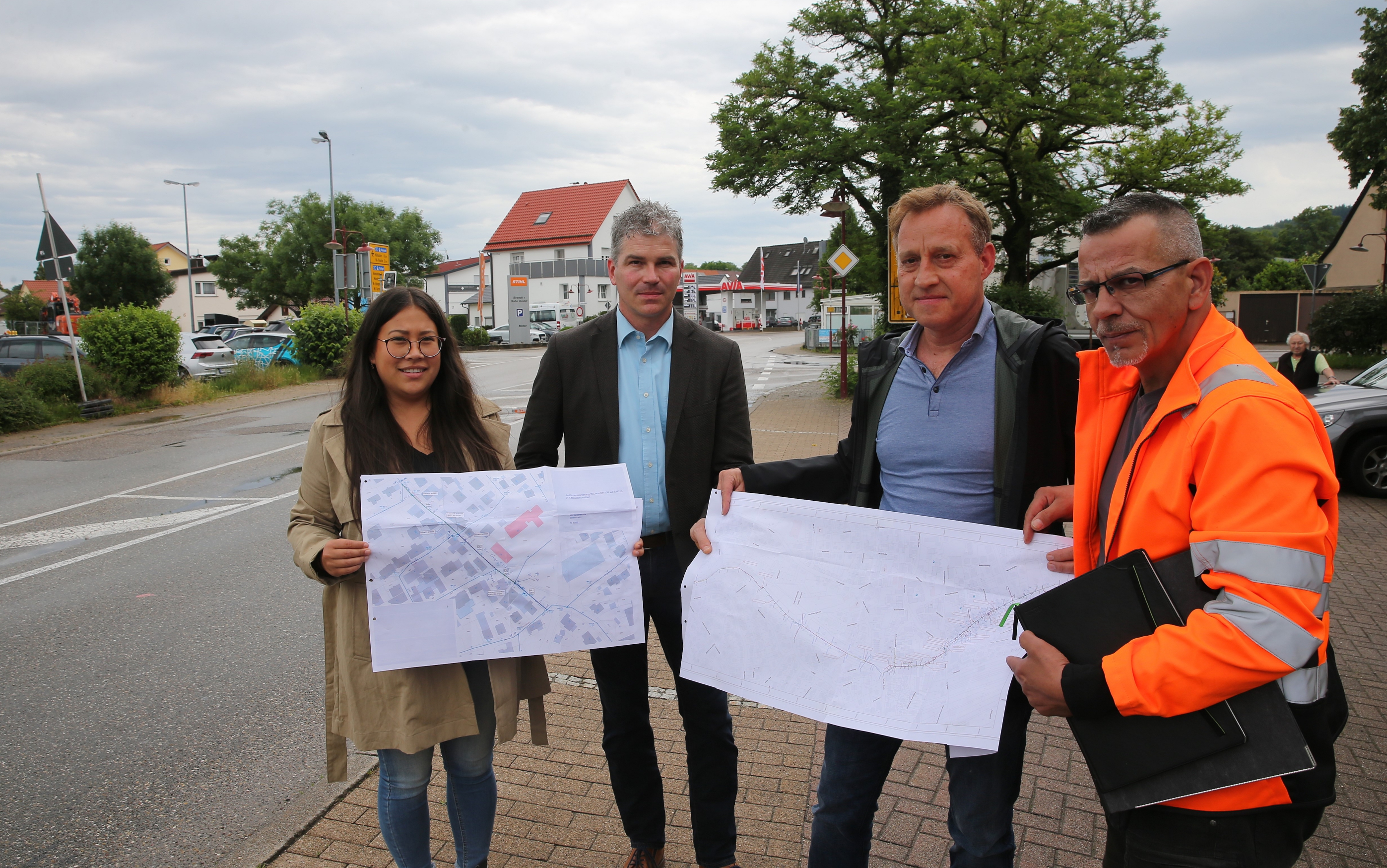 Hier beginnen in der nächsten Woche die Bauarbeiten an der Wiernsheimer Ortsdurchfahrt. Ordnungsamtsleiterin Sophie Shum, Bürgermeister Matthias Enz, Bauleiter Stefan Mondon und Bauhofleiter Tino Metzger stellen die Pläne zur Kanalsanierung vor. Foto: Küppers