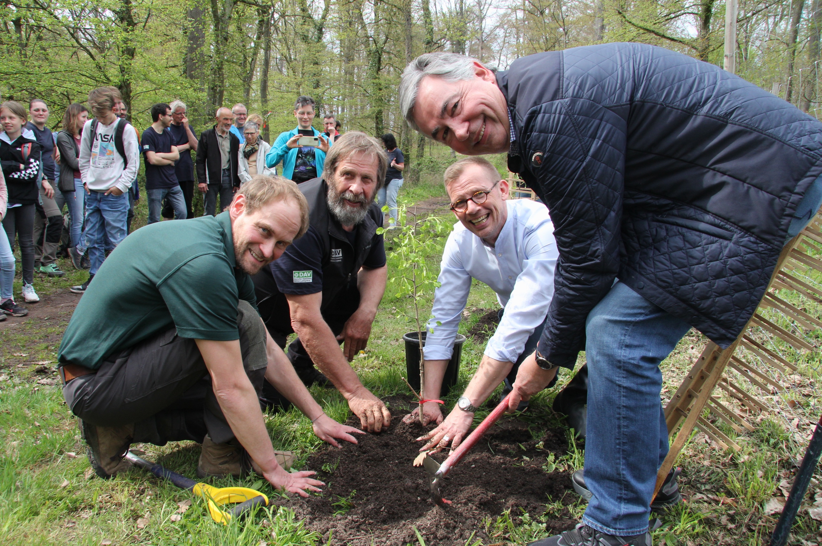 Genau 8306 Bäume hat der Deutsche Alpenverein seit 2019 im Vaihinger Stadtwald gepflanzt. Die vorerst letzten Exemplare setzten am Samstagnachmittag Forstamtsleiter Dr. Simon Boden, der DAV-Sektionsvorsitzende Roland Fischer, Vaihingens Oberbürgermeister Uwe Skrzypek und der Ludwigsburger Landrat Dietmar Allgaier (von links) gemeinsam in die Erde. Fotos: Banholzer