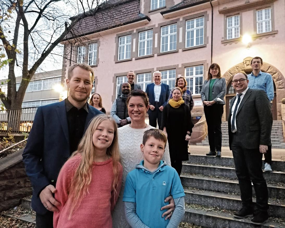 Jürgen Joos – hier im Vordergrund zusammen mit Ehefrau Manuela und den Kindern Emily und Bastian – wurde am Montagnachmittag wegen Corona lediglich in kleinem Rahmen zum neuen Schulleiter der Schlossbergschule ernannt. Foto: Banholzer