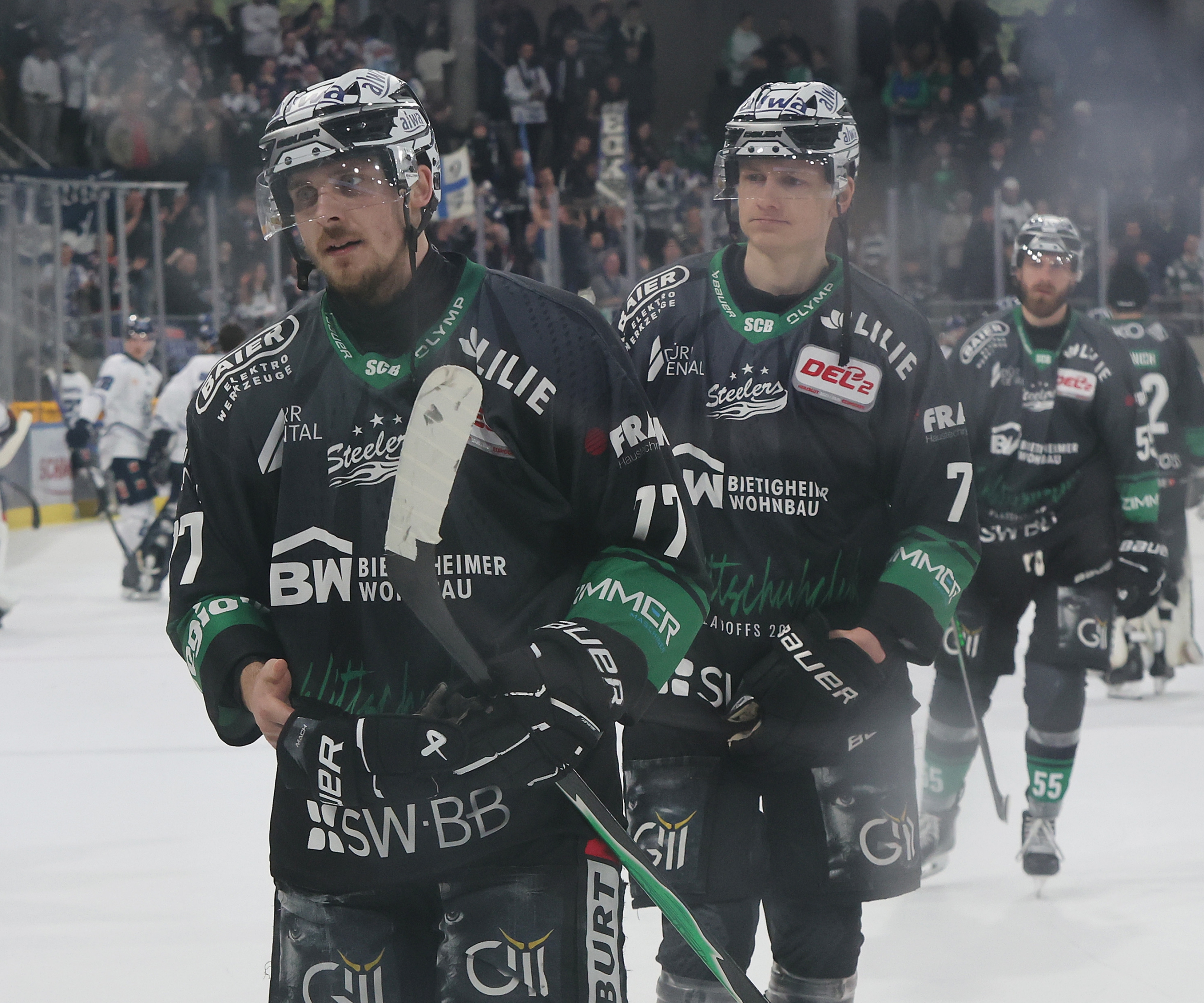 So blieb es zum sechsten Mal im sechsten Spiel eng im Schlussdrittel, in dem Dominic Turgeon die Enztal-Kurve nach viereinhalb Minuten verstummen ließ. Zwei seiner Versuche konnten nur geblockt, aber nicht geklärt werden. Als er die Scheibe zum dritten Mal auf dem Schläger hatte, versenkte er sie. Das Momentum war nun klar bei Kassel. Durch ein Powerplay, das ungenutzt bleibt, kam Bietigheim zurück in die Spur, hatte wieder das Heft des Handelns in der Hand und setzte sich vorne fest. Uplegger sorgte zwei Minuten vor Schluss für Ekstase an der Enz. Schmidt war gerade vom Eis, da bediente Eckl den torhungrigen Verteidiger, der das Spielgerät eiskalt in die Maschen jagte – sein viertes Tor in Folge. So ging es mal wieder in die Overtime, in der die gesamte Eishalle stand und mit jeder Chance der Steelers lauter wurde. Trotz Kecks Tor wurde die Bietigheimer Mannschaft noch minutenlang für eine tolle Saison gefeiert.