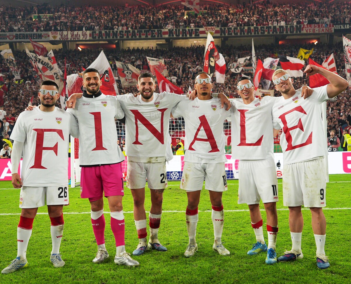 Die VfB-Spieler können ihr Glück kaum fassen und zeigen modisch, wo die Reise hingeht.Foto: VfB, Baumann (3)