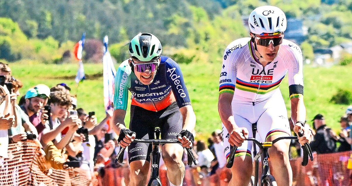 Paul Seixas (li.) fährt bei Lüttich-Bastogne-Lüttich dem Radsport-Superstar Tadej Pogacar noch hinterherFoto: /Elias Rom