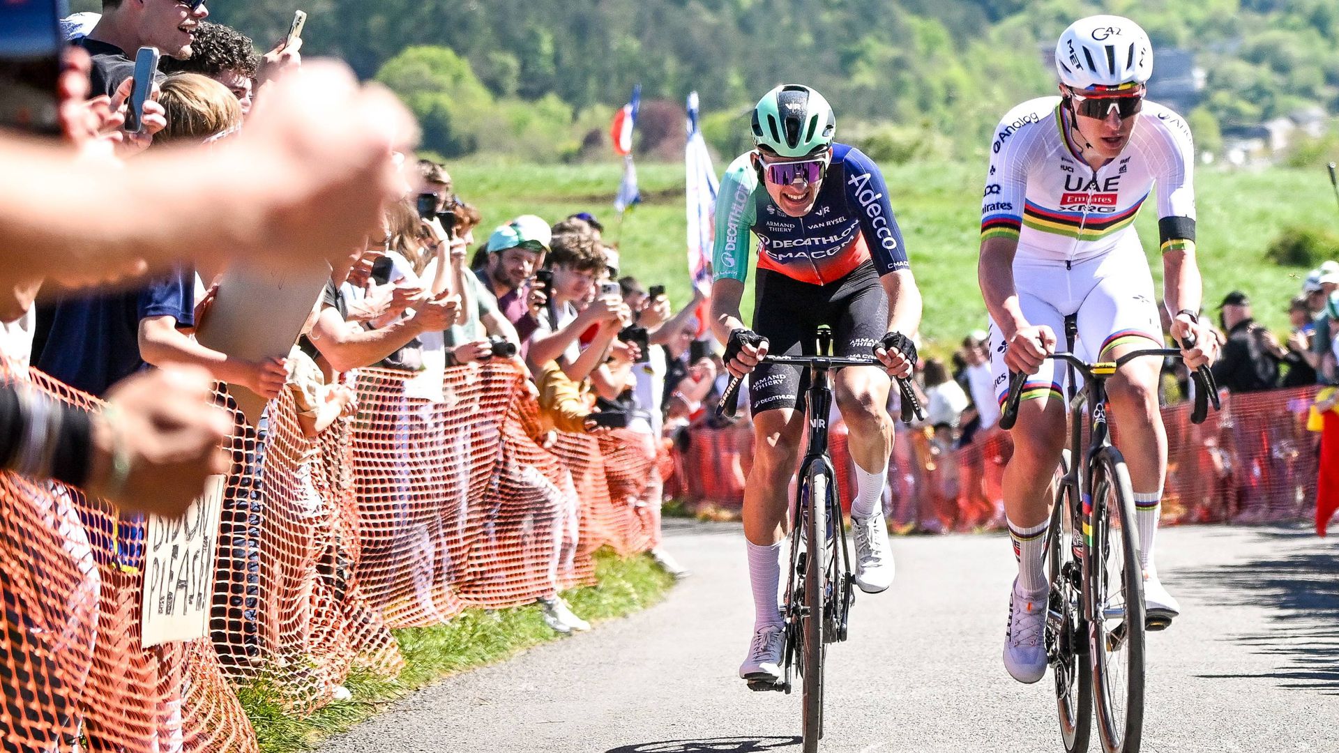 Noch ist Tadej Pogacar (re.) einen Tick stärker als Paul Seixas – wie er zuletzt bei Lüttich-Bastogne-Lüttich zeigte.Foto: IMAGO/Belga