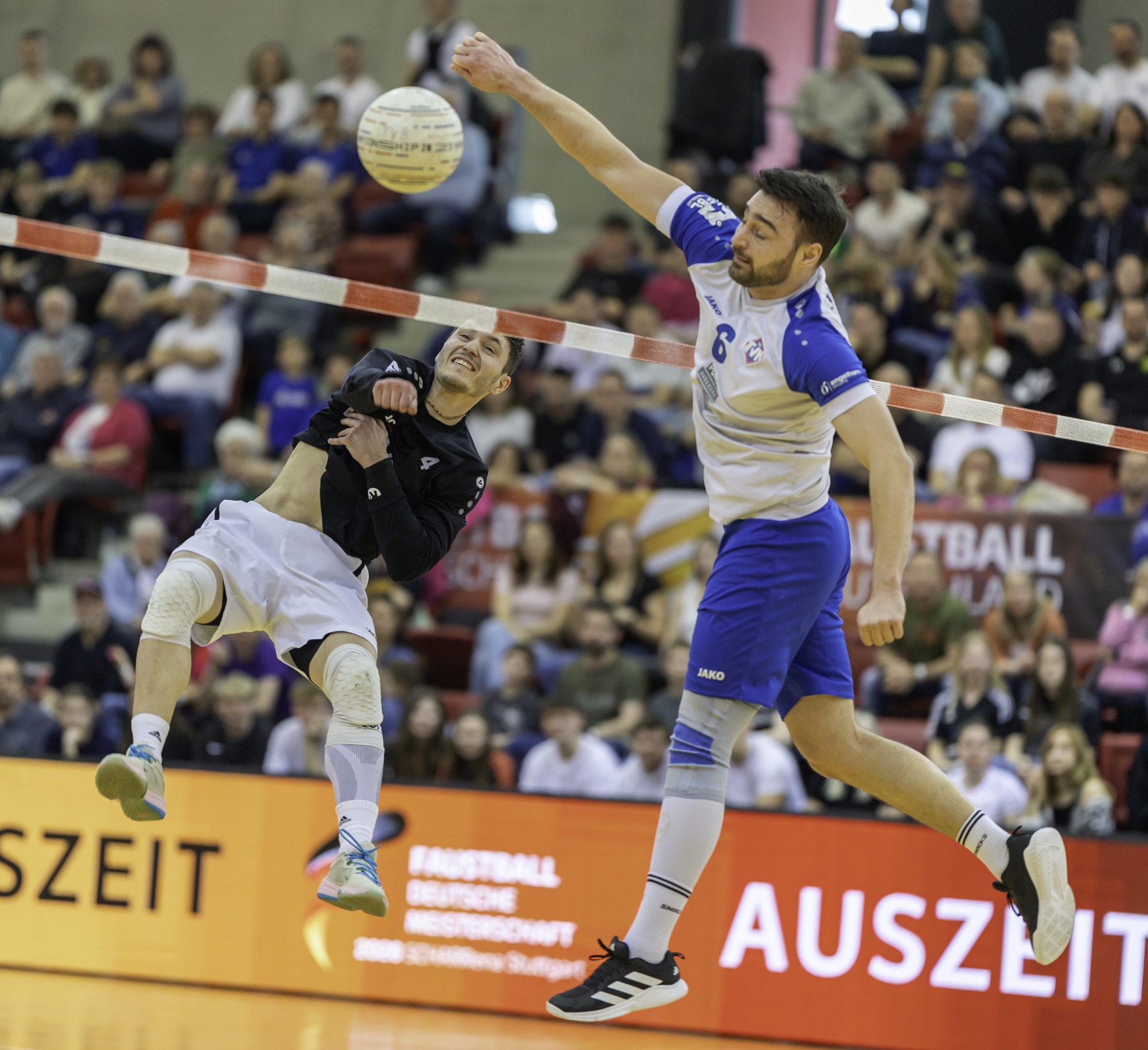 Das Finale verpasst, aber Bronze gewonnen: Der ehemalige Vaihinger Faustballer Johannes Jungclaussen (links) im Trikot des TV Brettorf. Foto: Spille/Deutsche Faustball Liga