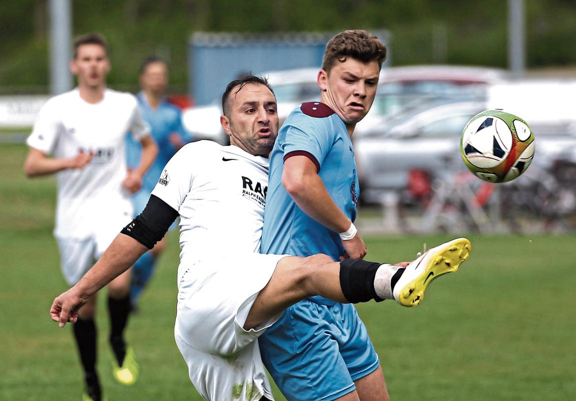 Auf Nick Heckele (rechts) – im Zweikampf mit Enzweihingens Özcan Koc – wartet am Sonntag mit Walheim eine schwere Aufgabe. Foto: Küppers