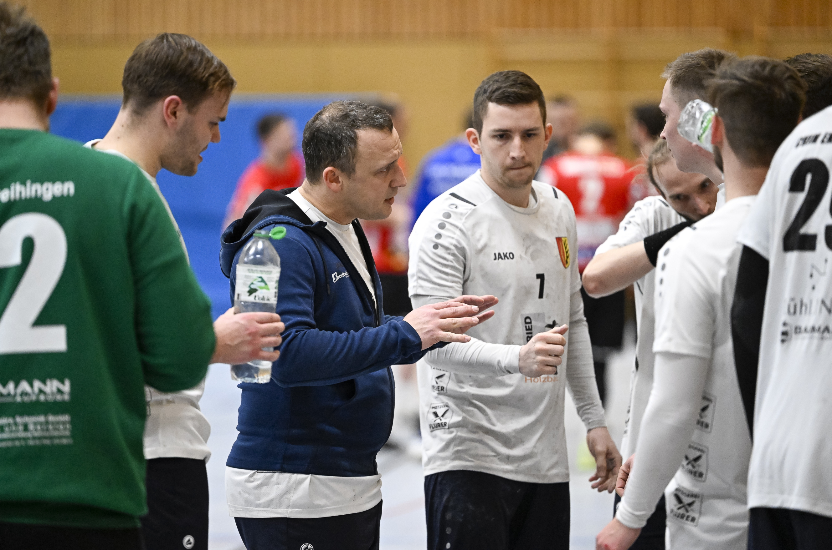 Einigen Gesprächsbedarf hatte der CVJM-Coach Simon Hees (3. von links) in einer Auszeit. Foto: Leitner
