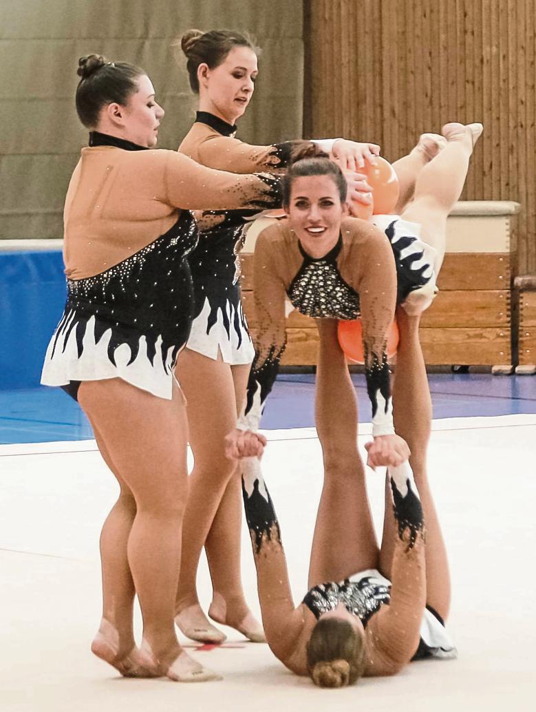 Rebecca Grimml, Sabrina Götz, Jasmin Geske und Julia Weh (links von links) sicherten sich souverän den Titel in der Landesliga. Lina Brenner, Paula Kolb, Mailin Widmann und Jasmin Tenzer (rechts oben von links) stiegen als Zweite der Bezirksliga in die Landesliga auf. Und die Gruppe AMASA (rechts unten), die jüngsten im Teilnehmerfeld, feierten ein gelungenes Debüt. Fotos: Simecek