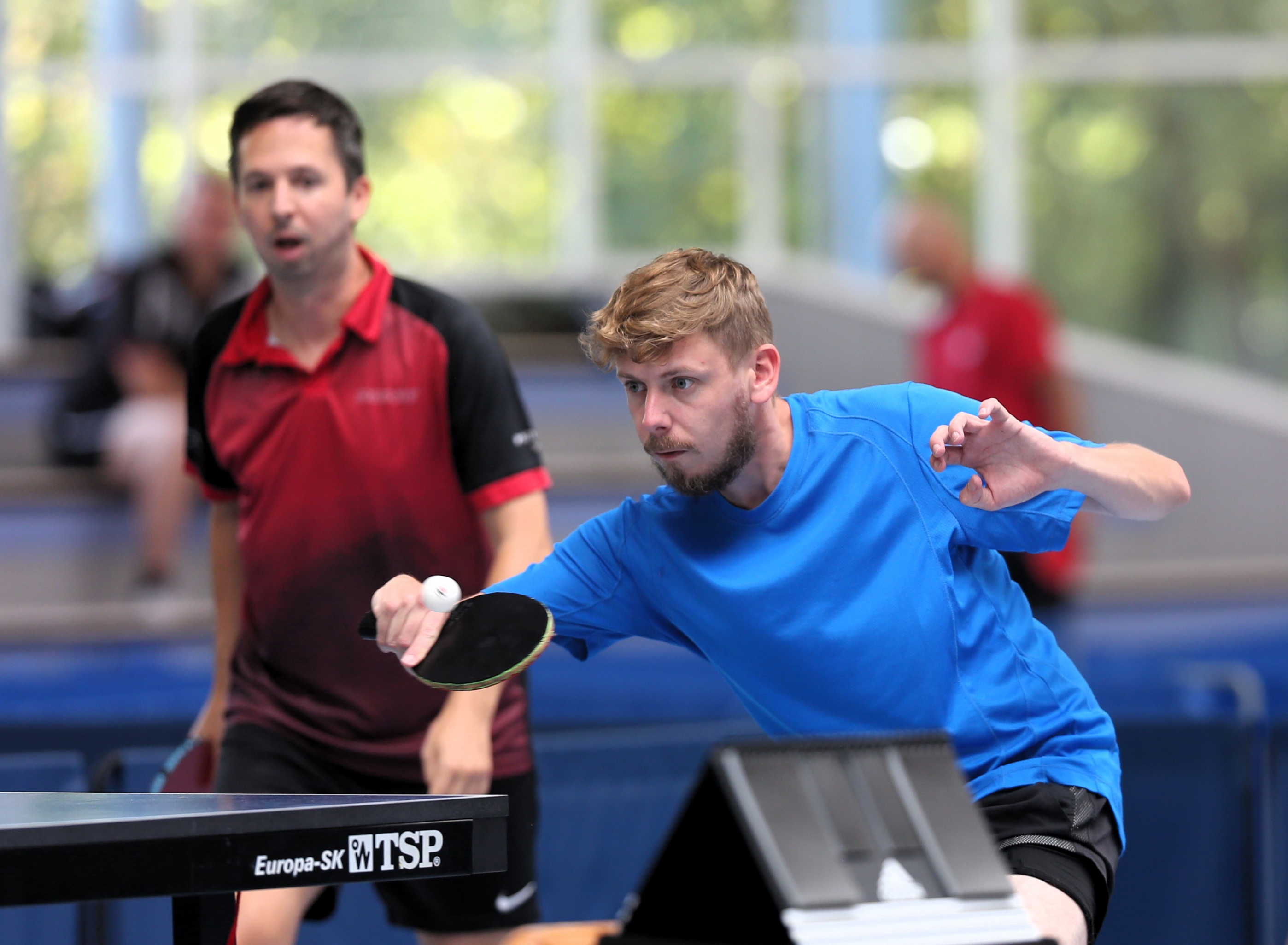Simon Brodbeck (vorne) von der SpVgg Mönsheim und Michael Grimmeisen vom TSV Großglattbach gehen bei den Männern C als Doppel ins Rennen. Im Viertelfinale verliert das Duo knapp und scheidet aus. Foto: Küppers
