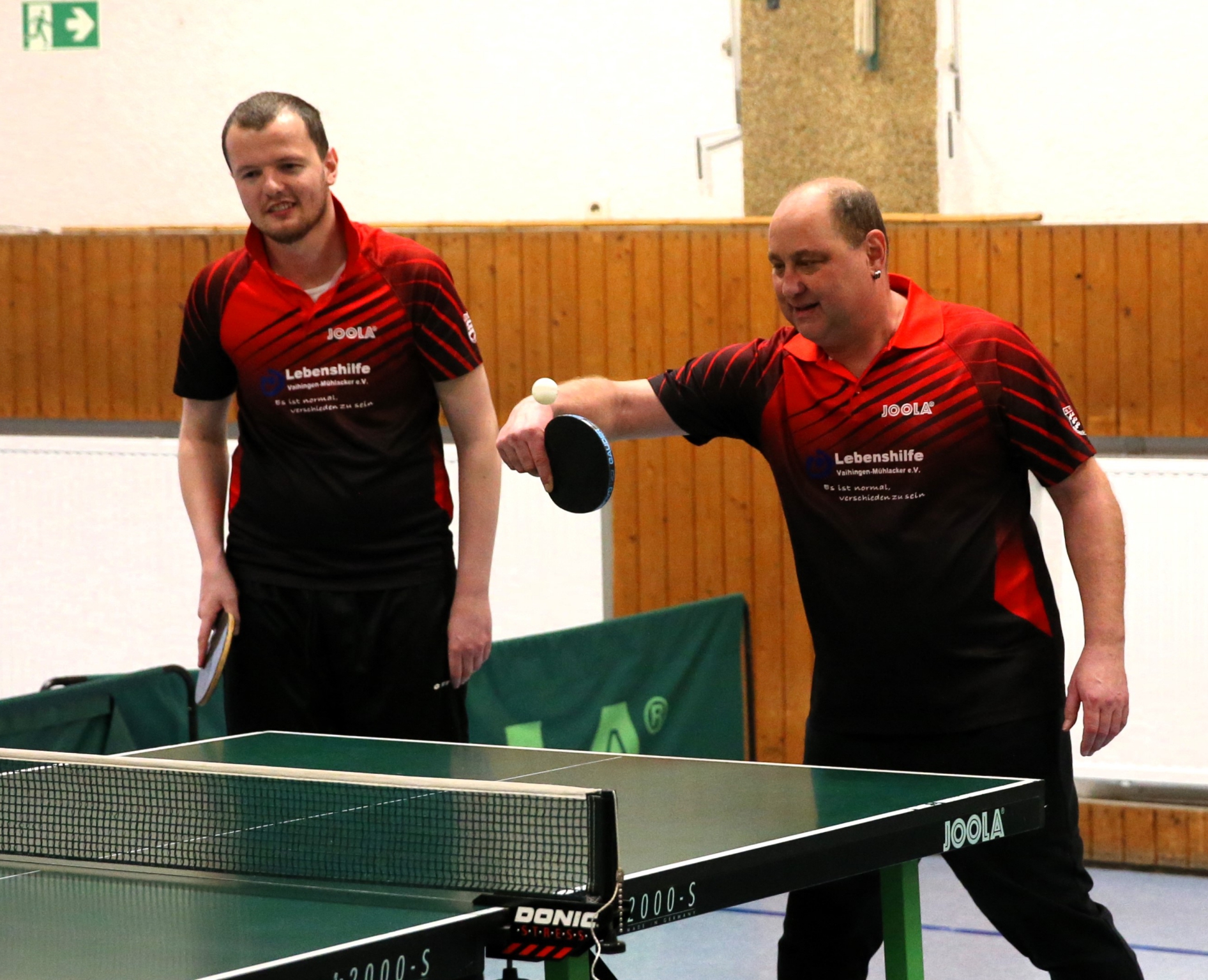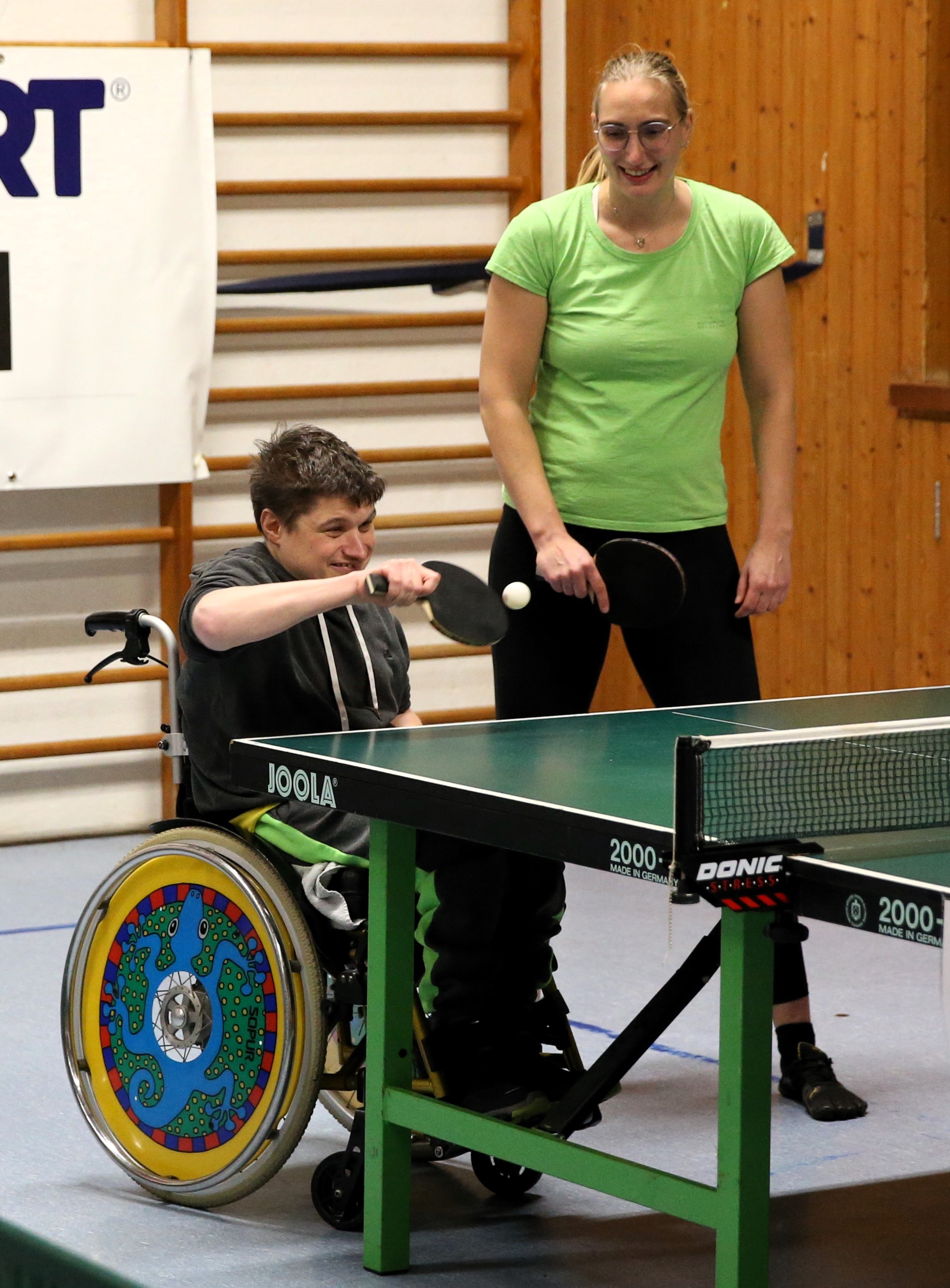 Gestern spielten Mähring und Ehmann ihr erstes gemeinsames Turnier. „Sind wir gut?“, fragt die Einfachmacherin. Ihr Begleiter strahlt sie an: „Ja!“ Für Tischtennisspieler im Rollstuhl gelten zwar etwas andere Regeln als für diejenigen, die sich mit einer geistigen Behinderung frei bewegen können, doch das stört hier keinen. Und auch, dass die Halle ganz und gar nicht dafür gebaut ist, mit Rollstuhl genutzt zu werden, wird gerne in Kauf genommen. „Wir dürfen die ganze Zeit im oberen Teil der Halle spielen“, berichtet Mähring über die Bemühungen der Turnierplaner. „Das ist doch ein super cooler Schritt der Barrierefreiheit.“ Ehmann ergänzt, dass die einzige echte Barriere eine Stufe am Haupteingang der Halle gewesen sei. Und da habe es genügend helfende Hände gegeben. In der Halle selbst kommt er gut klar.