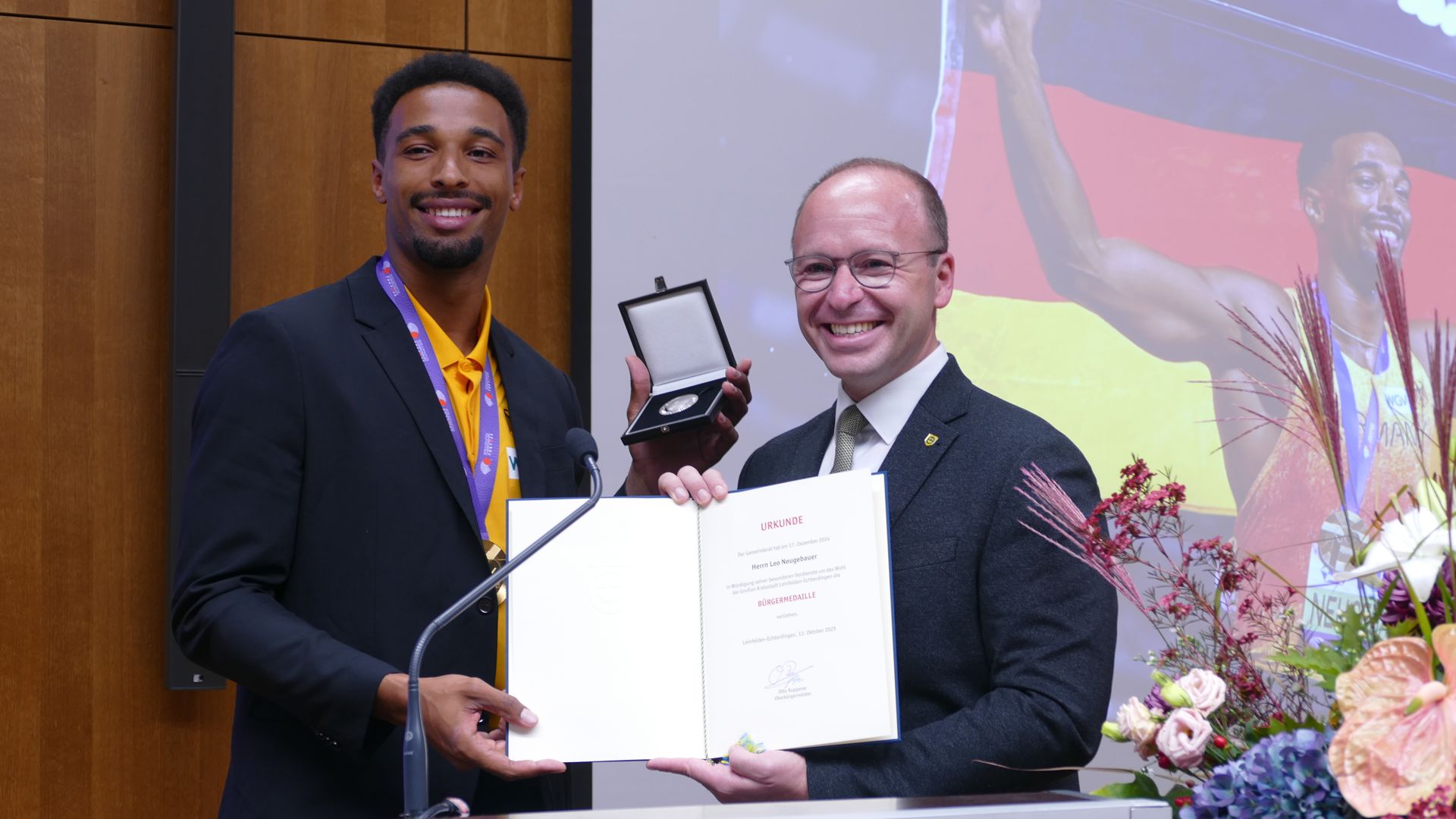 Großer Bahnhof für den frischgebackenen Zehnkampf-Weltmeister Leo Neugebauer in Leinfelden-Echterdingen. Die Stadt hat den Weltklasse Leichtathleten am Montagabend vor großer Kulisse mit der Bürgermedaille geehrt.