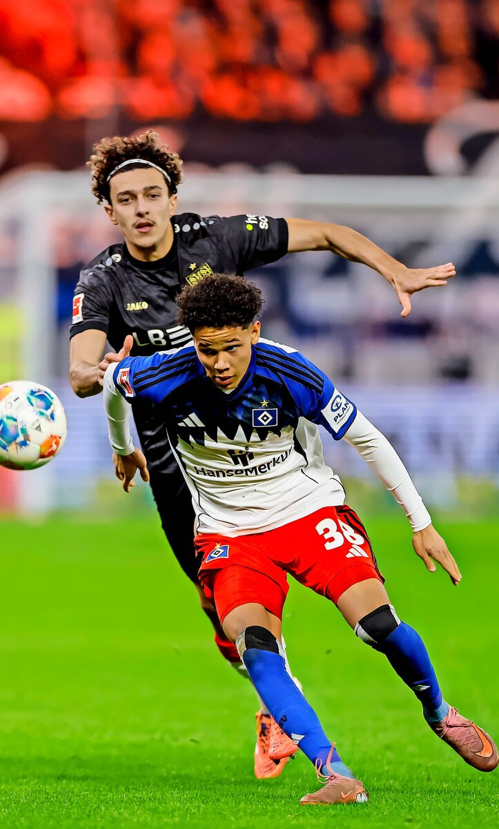 Eine Szene aus dem Hinspiel zwischen dem HSV und VfB Stuttgart vom 30. November 2025: Alexander Rossing-Lelesiit wird von VfB-Mann Ameen Al-Dakhil verfolgt.Foto: /P. Szyza