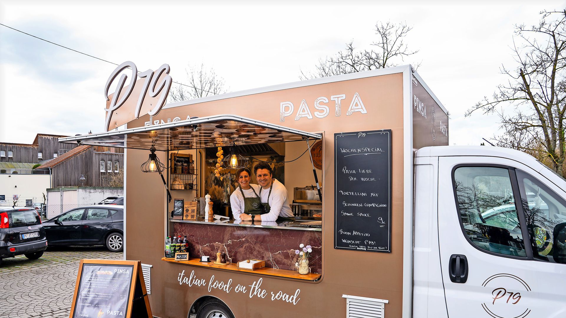 „Es war komisch, dass die bekannten Strukturen plötzlich weg waren. Dazu kamen Existenzängste, was passiert, wenn mein Mann nicht mehr in den Beruf zurückfindet“, erinnert sie sich an diese Zeit. „Ich war gefangen zwischen der Sorge für die Familie und der Erkenntnis, dass man nur für andere da sein kann, wenn man selbst glücklich ist“, denkt er zurück. „Auf dem Rückweg von einem Familienausflug mit den drei Kindern überholten wir auf der Autobahn einen Foodtruck“, beschreiben beide die Geburtsstunde zur Selbstständigkeit im rollenden Gastrogewerbe. Die heißt P79 und geht mittlerweile mit dem zweiten eigenhändig aus Florenz importierten Foodtruck im stylischen Retrodesign erfolgreich ins fünfte Jahr. Wobei P für Pinsa, Pasta sowie für Peppina und Peppino, die Spitznamen der beiden, und 79 für ihr Geburtsjahr stehen. Dass das Ehepaar mit italienischem Pass und deutschem Eigenheim viele Stammkunden hat, liegt zum einen daran, dass die Pinsa, eine entfernt an Pizza erinnernde italienische Hefeteigspezialität aus Reis-, Soja- und Weizenmehl, der mit hausgemachter Tomatensoße bestrichen und mit variablen Zutaten belegt wird, einfach lecker schmeckt. Und erklärt sich zum anderen damit, dass die beiden neben der italienischen Küche auch italienische Lebensart zu den Kunden bringen.