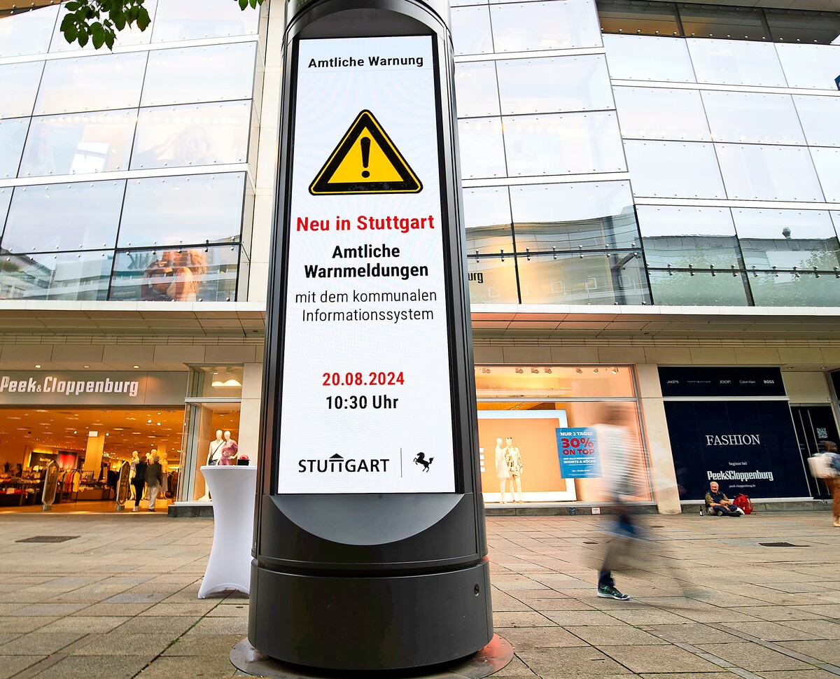 Stuttgart - Das gelbe Dreieck zieht am Dienstagvormittag die Blicke der Vorbeigehenden an. Denn dazu steht auch noch „Warnmeldung“ auf der Litfaßsäule nahe dem Pusteblumenbrunnen an der Königstraße. Noch ist aber nichts passiert: Es ist erst die Ankündigung einer neuen Möglichkeit, die Bürgerinnen und Bürger im Notfall warnen zu können. Die sogenannten digitalen Stadtinformationsanlagen – rund 300 an der Zahl in ganz Stuttgart – können nun direkt von der Feuerwehr bespielt werden – zusätzlich zu den bestehenden Möglichkeiten über Medien, Warn-Apps und Cell Broadcast auf dem Handy.